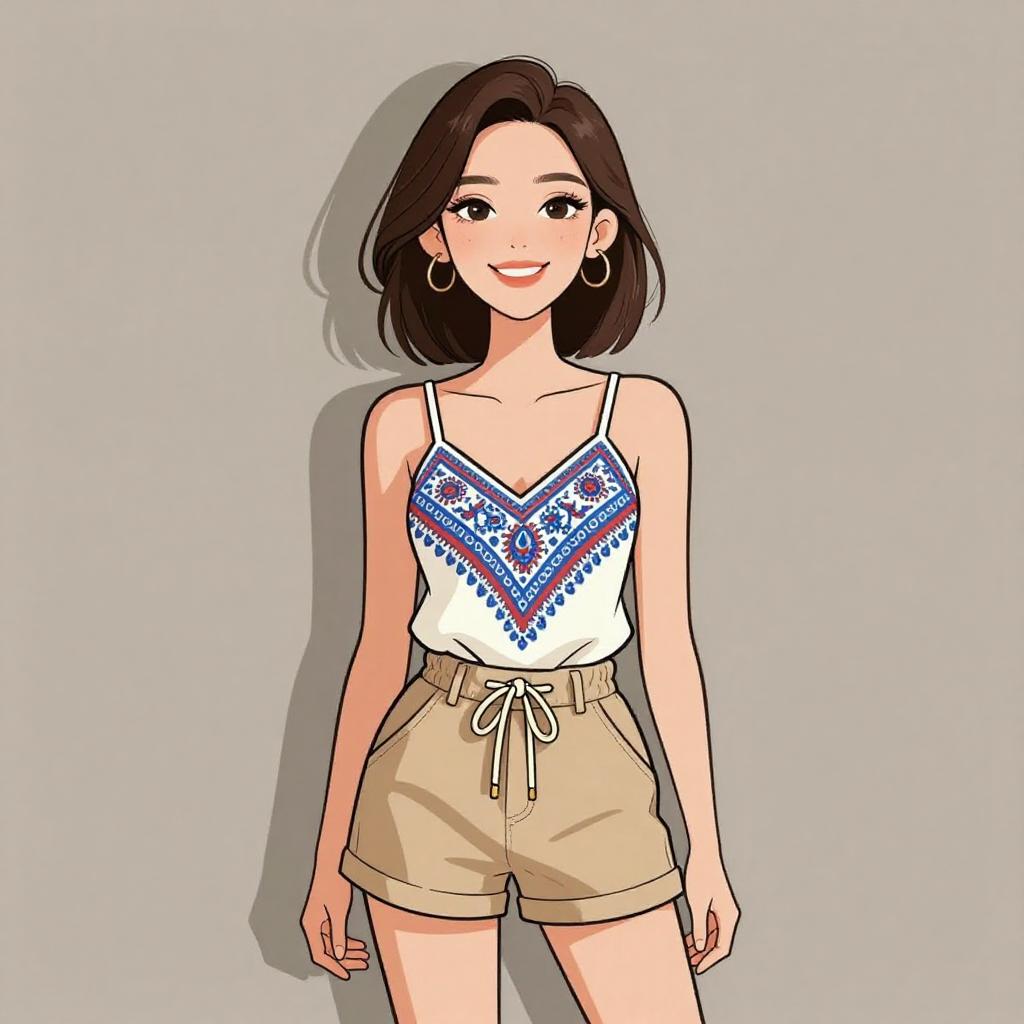 Digital illustration of an Asian woman with shoulder-length brown hair, wearing a white one-shoulder crop top and black floral shorts, standing against a gray