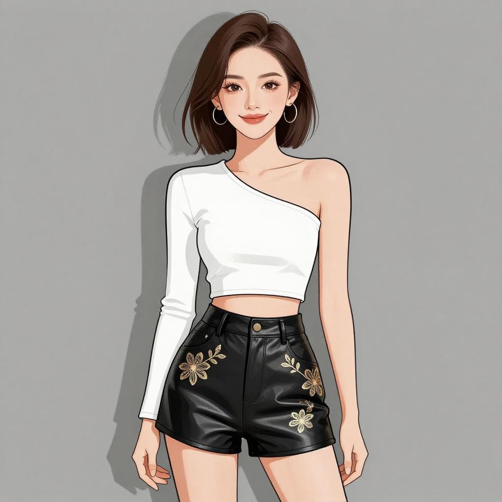Digital drawing of an Asian woman with fair skin and straight, shoulder-length black hair. She wears a white, long-sleeve, one-shoulder crop top and black high-waisted shorts with gold floral embroidery. She has small hoop earrings and a confident, slight smile. The background is a solid gray, casting a subtle shadow behind her. The style is clean and modern, with bold outlines and flat colors.