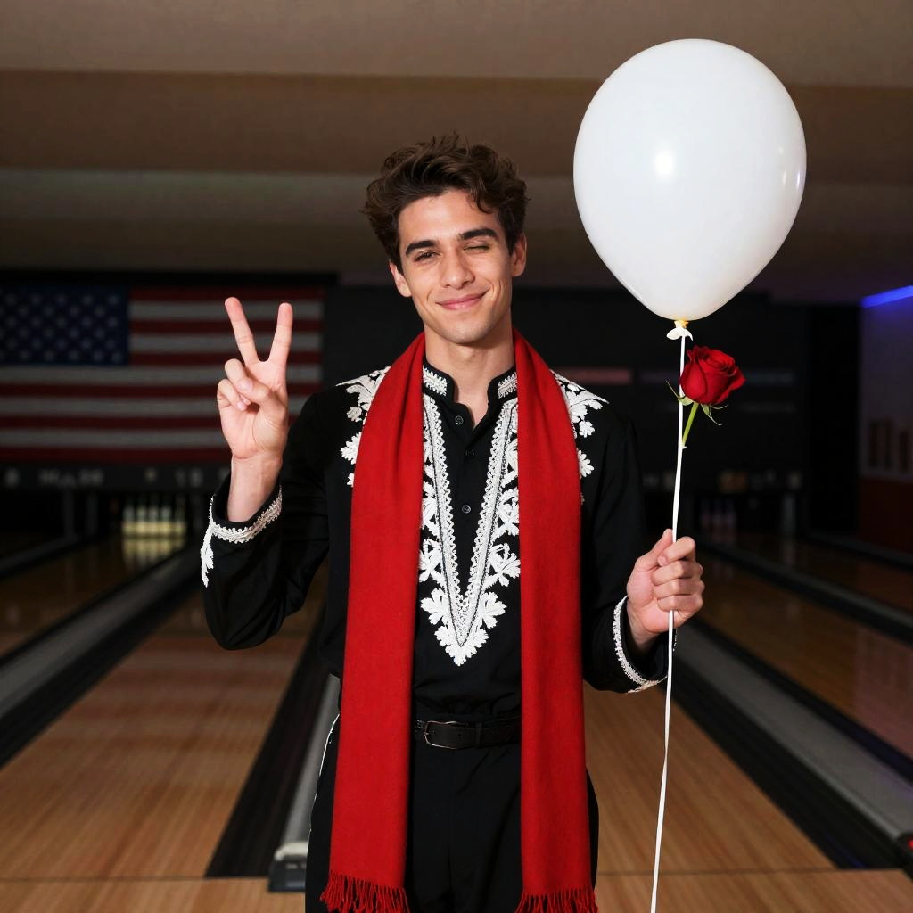Male in elaborate black and white embroidered outfit, red scarf, holding white balloon with red rose, making "peace" sign with right hand, standing in dimly lit bowling alley, American flag in background, short brown hair, smiling, one eye closed.