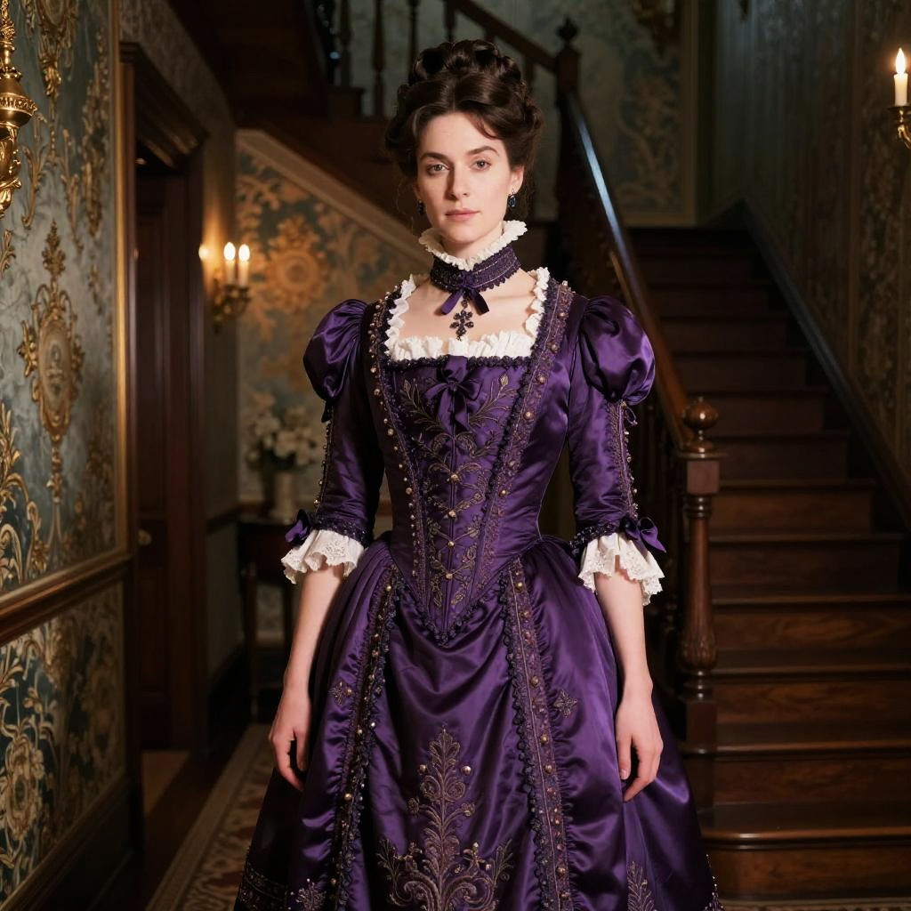 Cinematic film still beautiful woman, photograph, ((dark blue) victorian dress), library, candlelight, (full body), period drama, (black lace overlay), brooch . shallow depth of field, vignette, highly detailed, high budget, bokeh, cinemascope, moody, epic, gorgeous, film grain, grainy