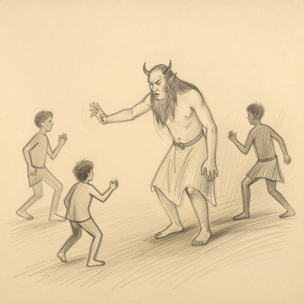 Sepia-toned sketch of three small, naked children running from a large, bearded, horned minotaur in a loincloth.