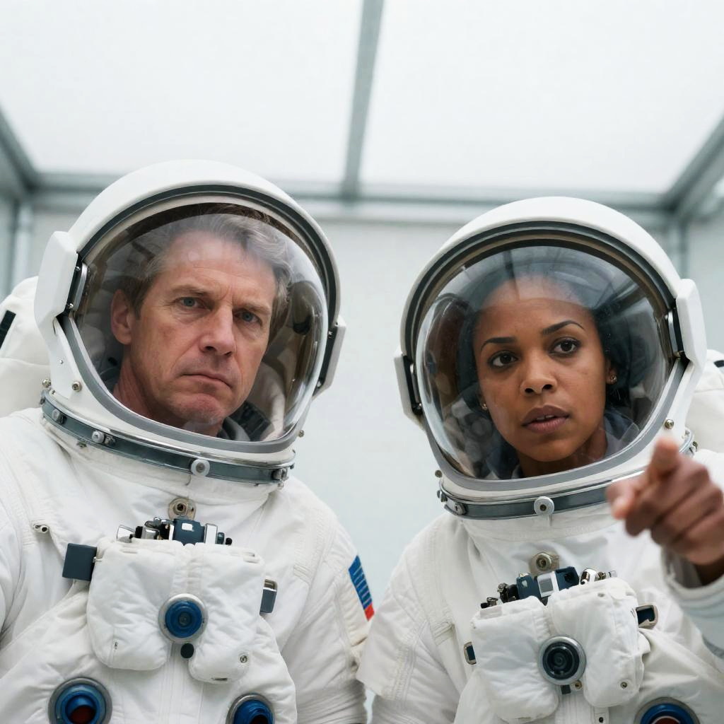 Photograph of two people in space suits with clear visors. The man on the left has dark skin, a mustache, and a gold and red suit. The woman on the right has light skin, brown hair, and a purple suit. Both look serious. They are in a dimly lit, industrial setting.