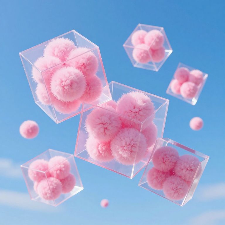 Transparent cubes brimming with fluffy pink spheres float serenely against a vibrant blue sky, defying gravity in a whimsical, dreamlike tableau.