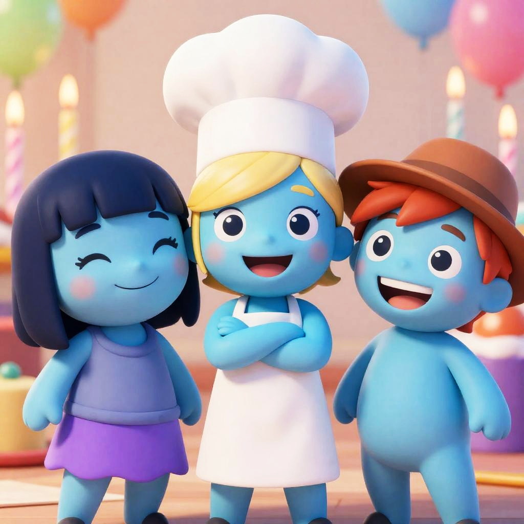 Digital illustration of three blue-skinned, cartoonish characters with exaggerated features. Central character, blonde-haired, wears white chef hat and dress, smiles confidently. Left character, black-haired, purple skirt, gray top, smiles subtly. Right character, red-haired, brown hat, shirtless, grins broadly. Background filled with colorful, lit birthday candles. Characters stand closely together, interacting joyfully.