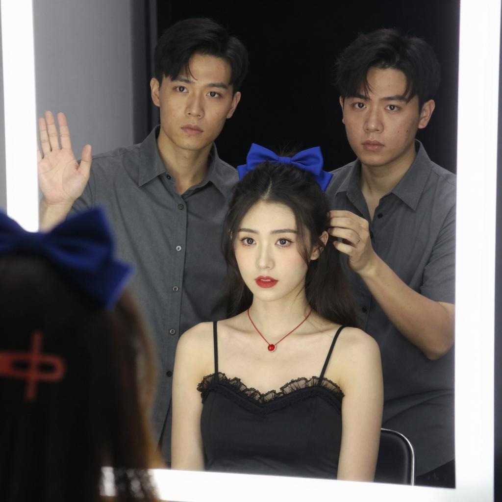 Three young adults in an outdoor urban setting with a brick wall and blue banner background. A blonde woman with short hair wearing a pink vest over a black top is having makeup applied by two individuals in white shirts. One person applies eyeliner while the other adjusts her hair. Another woman in the background has her mouth open showing an intense expression.