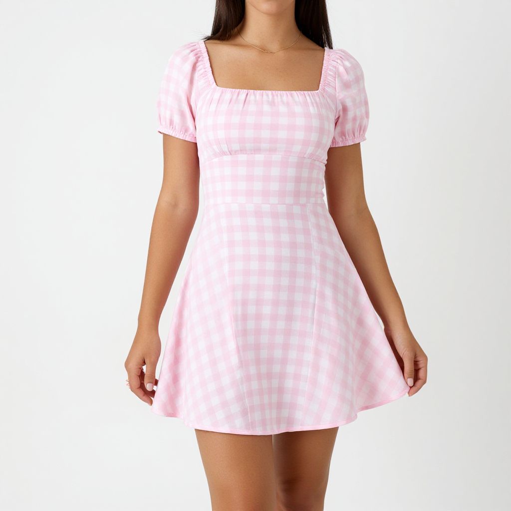 "Woman, casual summer, short gingham dress in pastel pink and white checkered pattern, square neckline, short puffed sleeves with elastic cuffs, fitted bodice, A-line skirt, mini-length, pale pink slide sandals with bow detail, simple gold necklace, white studio background.. Sexy. Pretty face and beаutiful eyes. Big breasts."