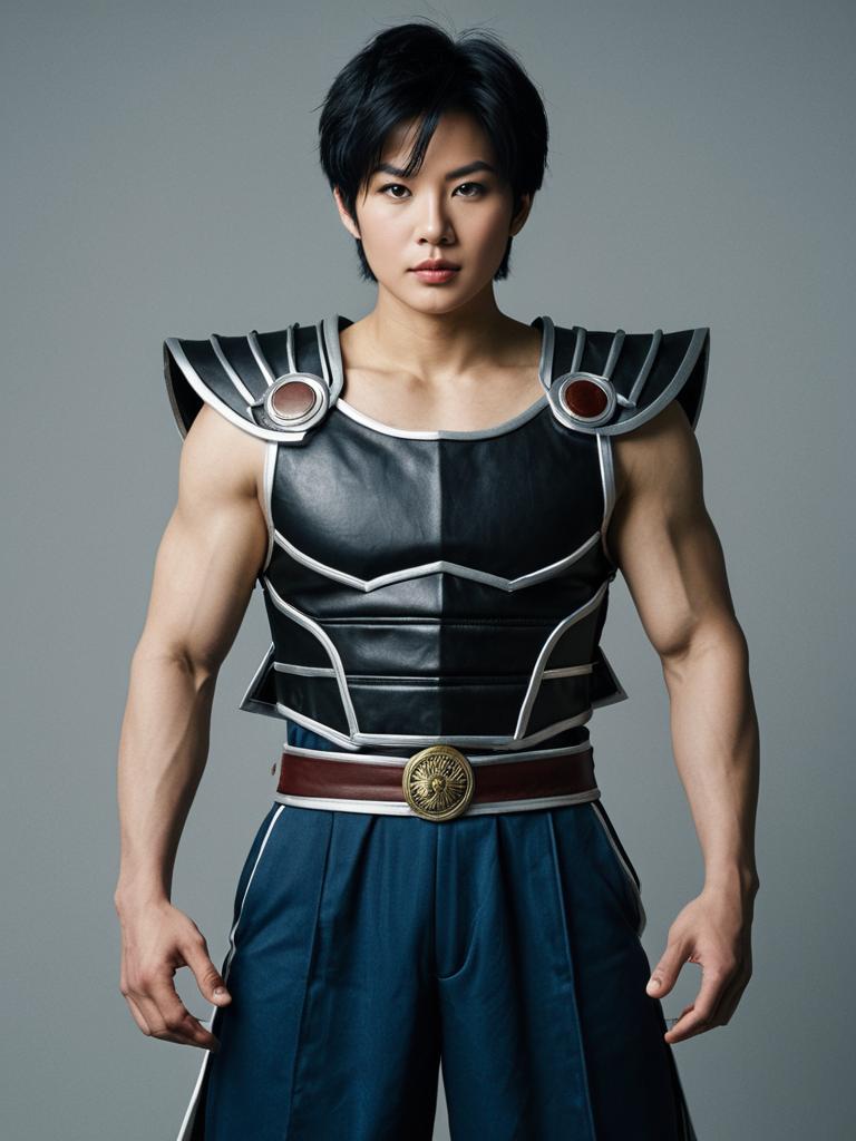 Alpha chun costume, 1boy, solo, male focus, black hair, standing, arms behind back, grey background, realistic, dougi, looking at viewer