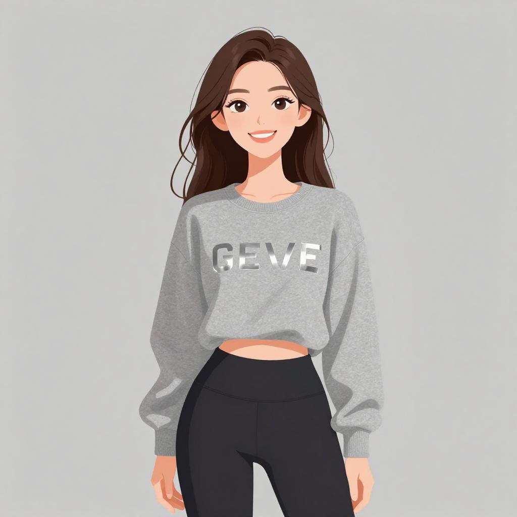 Woman with pretty face and pretty hair. smiling Woman, casual, maroon crew neck sweatshirt with white typography print, long sleeves, light gray skinny jeans, chunky silver tone statement necklace. --sref 1467