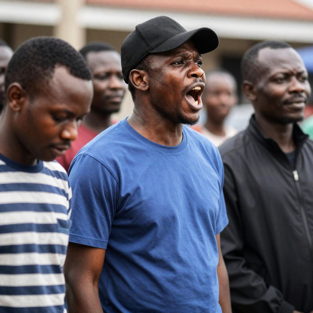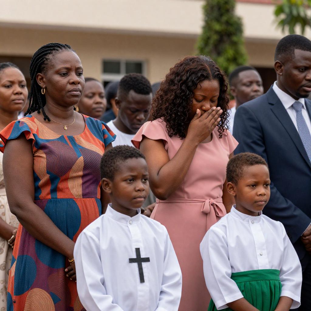 Photograph of a group of people at a religious ceremony. Women in colorful dresses and a man in a suit stand beside children in white and green church clothes. One woman with curly dark hair in a pink dress is central, covering her mouth. A young boy in a white outfit with a cross stands in the foreground. Background includes a beige building and greenery. Intense expressions on faces.