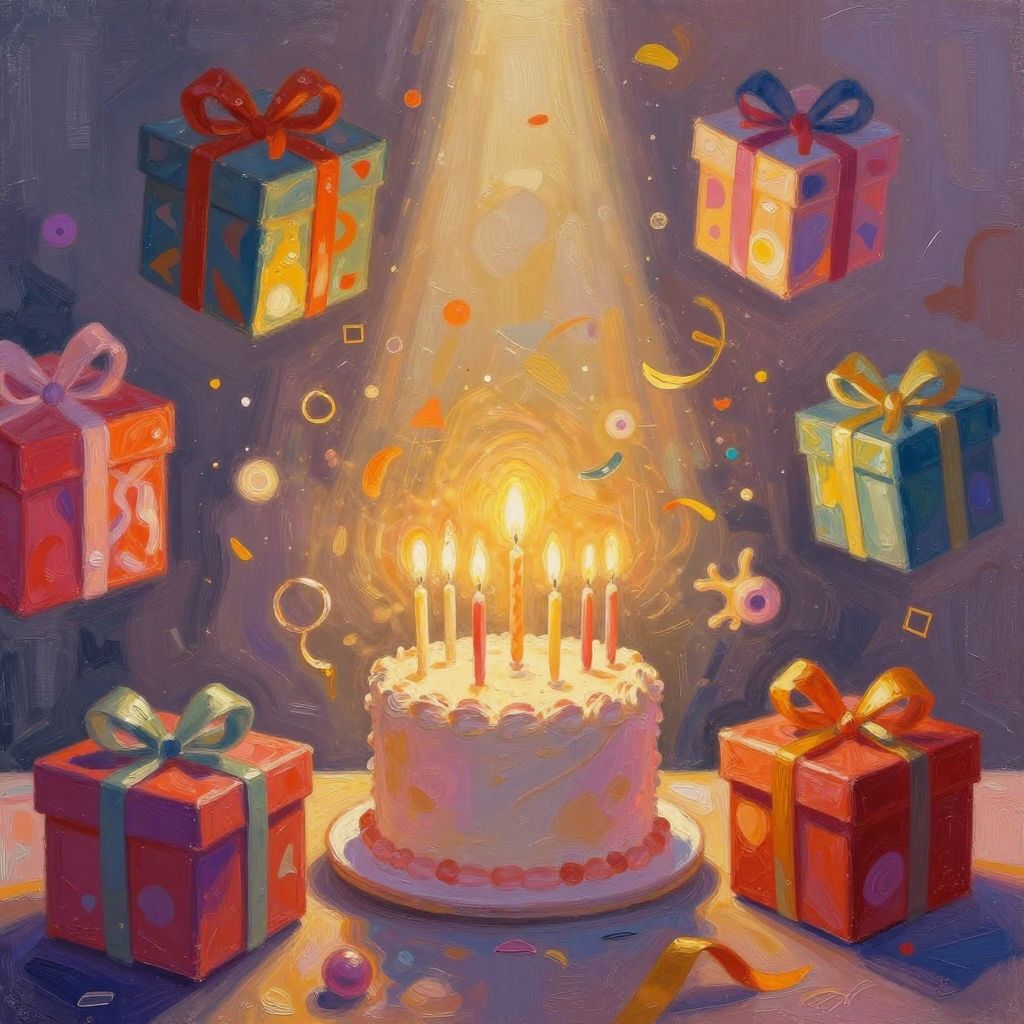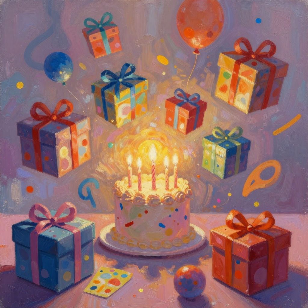 Artsy birthday images showcasing surreal birthday party scenes with floating gifts, abstract colorful shapes, expressive brush strokes, warm glowing lights, digital painting style