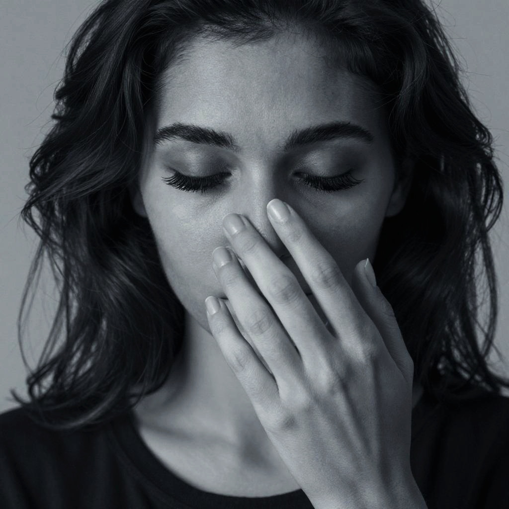 Black-and-white photograph of a woman with long, wavy hair, closed eyes, and manicured nails, covering her mouth with her hand, conveying