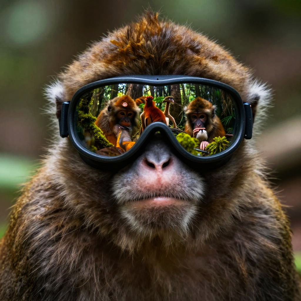 Close-up of monkey forest goggles reflecting the rich variety of forest creatures and mossy trees, textured fur on the monkey, hyper-detailed wildlife portrait with natural lighting