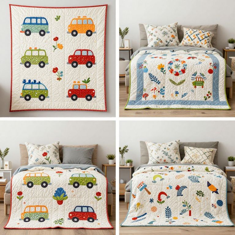 Camping-themed quilts featuring vibrant vehicles and floral patterns are showcased in four distinct settings, highlighting their playful design and versatile appeal for cozy camping decor.