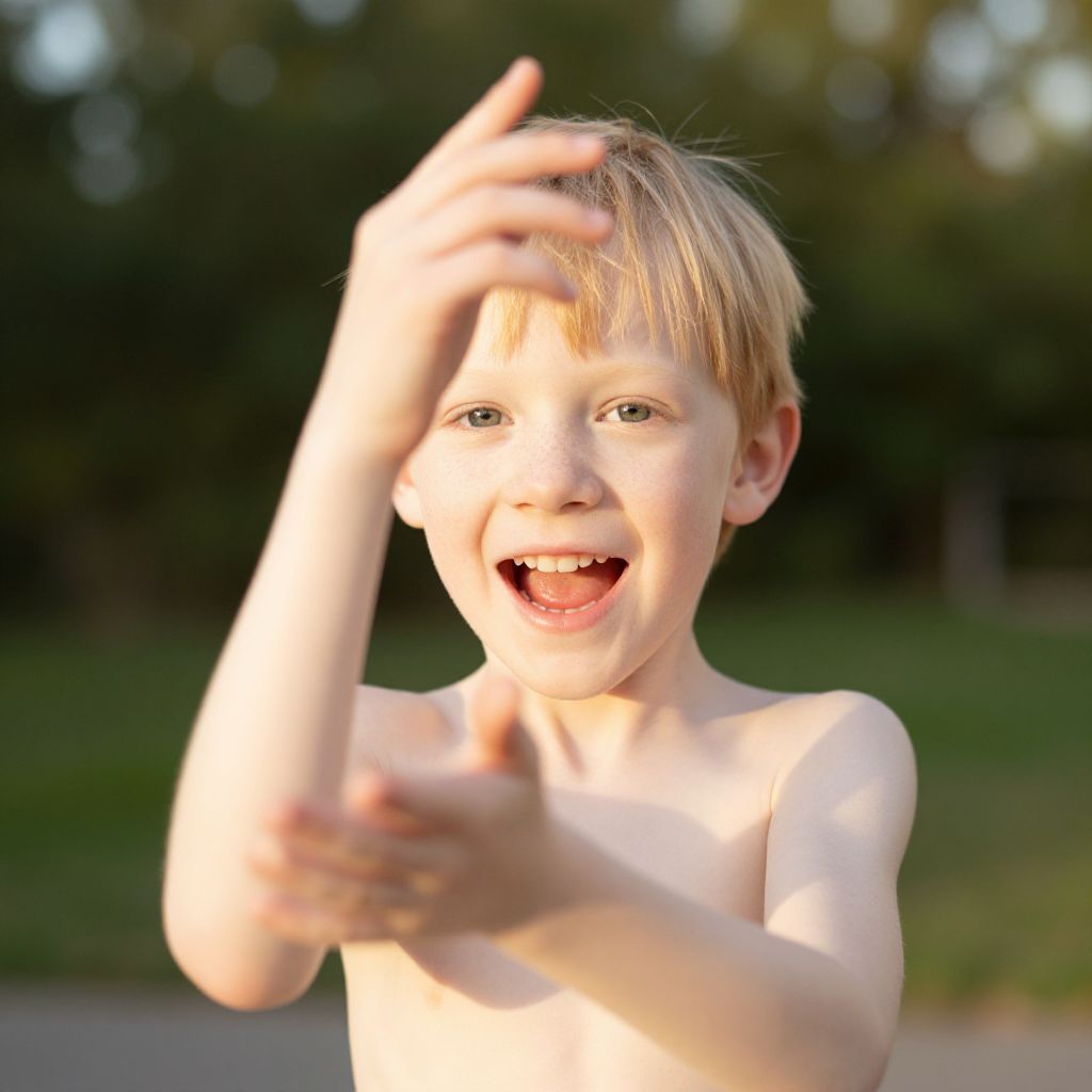 Photograph of a young, fair-skinned boy with light blonde hair, smiling broadly with his mouth open. He is shirtless, with a slight build, and is raising his right hand to his head while his left hand extends forward. His expression is joyful and playful. The background is blurred, featuring green foliage and sunlight, suggesting an outdoor setting. The boy's skin is illuminated by the sunlight, highlighting his freckles. The image captures a moment of exuberant happiness, with a shallow depth of field focusing on the boy's face and upper body.