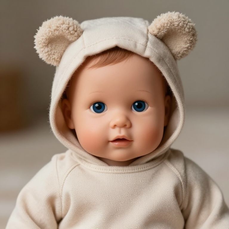 Photograph of a baby doll with blue eyes, wearing a beige hooded onesie with bear ears, against a blurred neutral background.