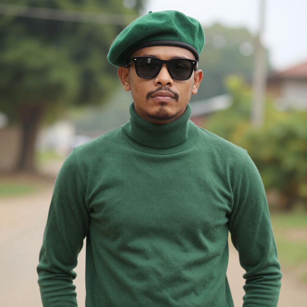 Portrait of a man wearing a green turtleneck shirt and matching green beret hat. He has a green skin tone and is wearing black sunglasses. The background is an outdoor setting with blurred greenery, creating a natural environment. The man is looking directly at the camera with his arms behind his back.