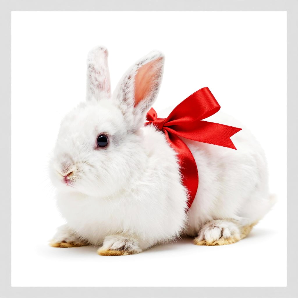 Photograph of a fluffy white rabbit with soft, thick fur. The rabbit has black eyes and pink inner ears, and is adorned with a bright red satin bow around its neck. It is sitting on a clean, white background, which highlights the rabbit's white fur and the vibrant red of the bow. The rabbit's small, pink paws are visible as it rests on the ground. The image has a high contrast and sharp focus, emphasizing the textures of the rabbit's fur and the glossy ribbon.