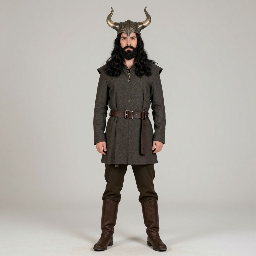 Photograph of a bearded man standing against a plain white background. He wears a Viking-style horned helmet with curved horns, long black wavy hair, and a dark gray, long-sleeved tunic with buttons and a brown leather belt. His dark brown pants are tucked into knee-high black boots. He stands with a neutral expression, his arms relaxed at his sides. The lighting is even, highlighting the textures of his clothing and the metallic sheen of his helmet horns. The overall style is medieval-inspired cosplay.