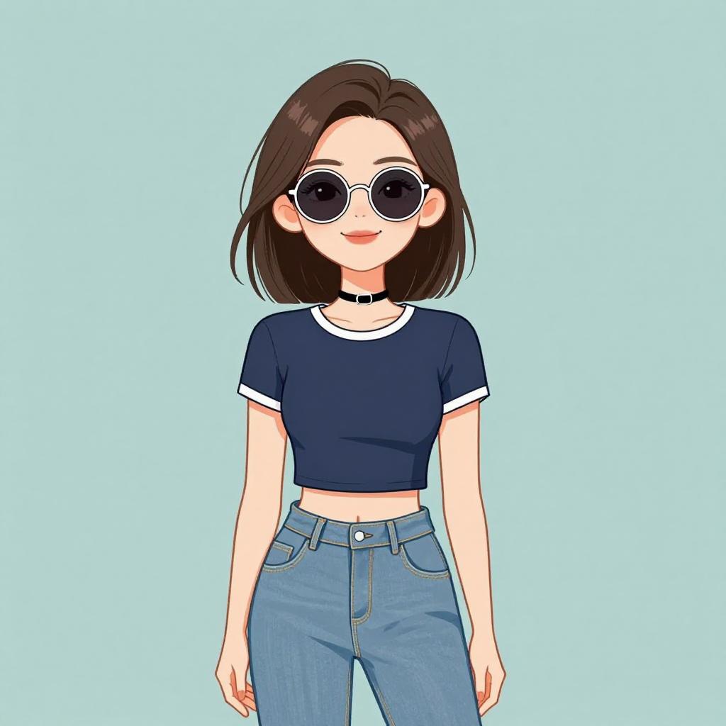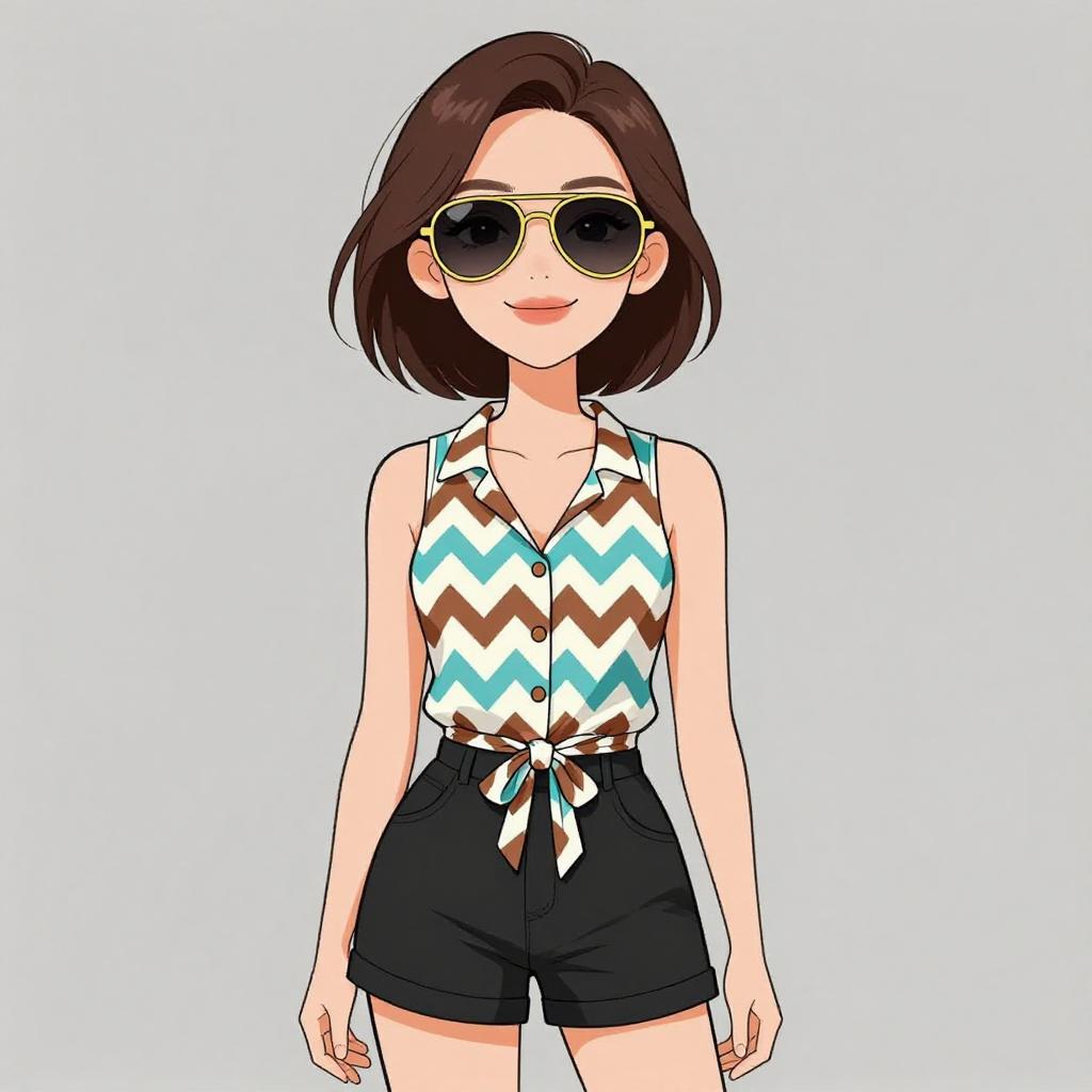 Woman with pretty face and pretty hair. smiling Woman, casual, light beige button-up shirt with short sleeves and collared neckline, fitted silhouette, tucked into blue skinny jeans, sunglasses with large square frames. --sref 1467