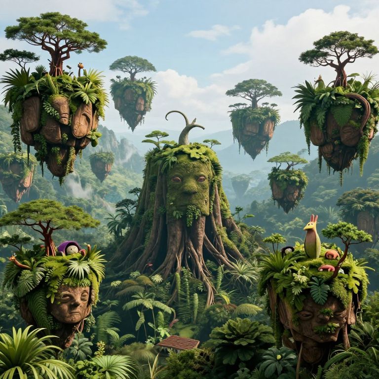 Digital fantasy artwork of lush, floating forest with treehouses shaped like human faces, surrounded by dense, vibrant greenery and misty sky.