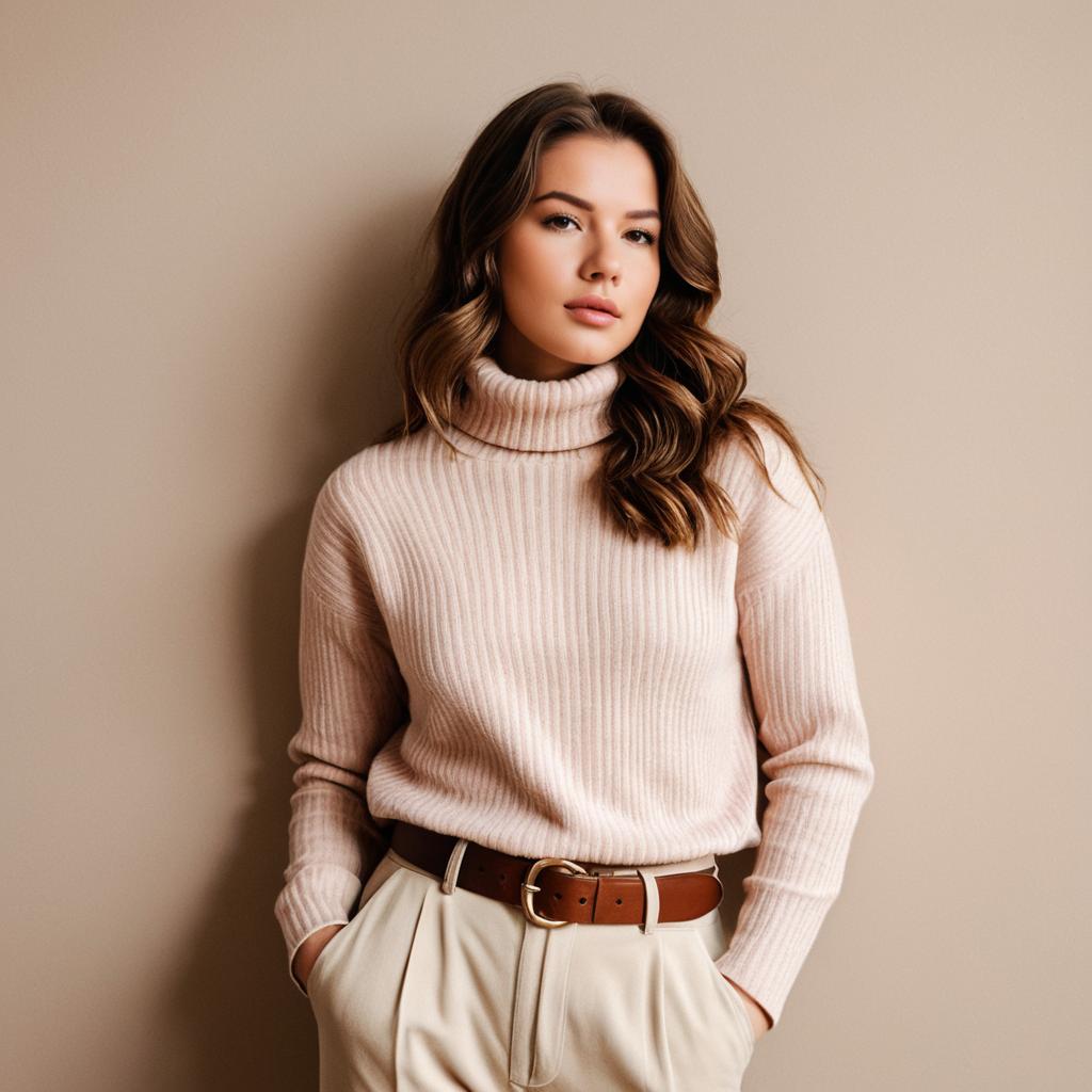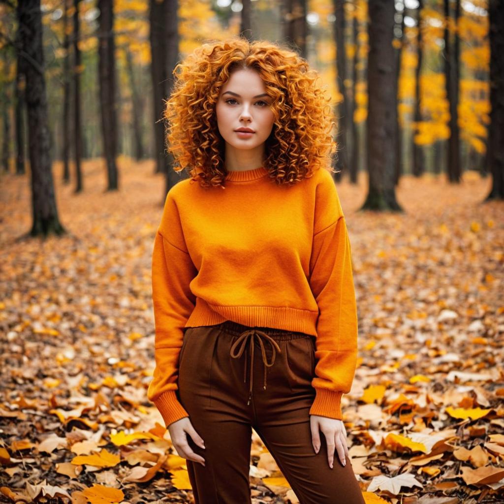 Fall woman fashion, photorealistic portrait of a young woman with long brown hair, wearing a brown ribbed knit sweater and high-waisted brown pants, standing in an autumn forest, orange leaves in the background, soft natural light, neutral expression, hands in pockets, casual fall fashion, daytime, medium close-up, realistic ures, detailed background, warm color palette
