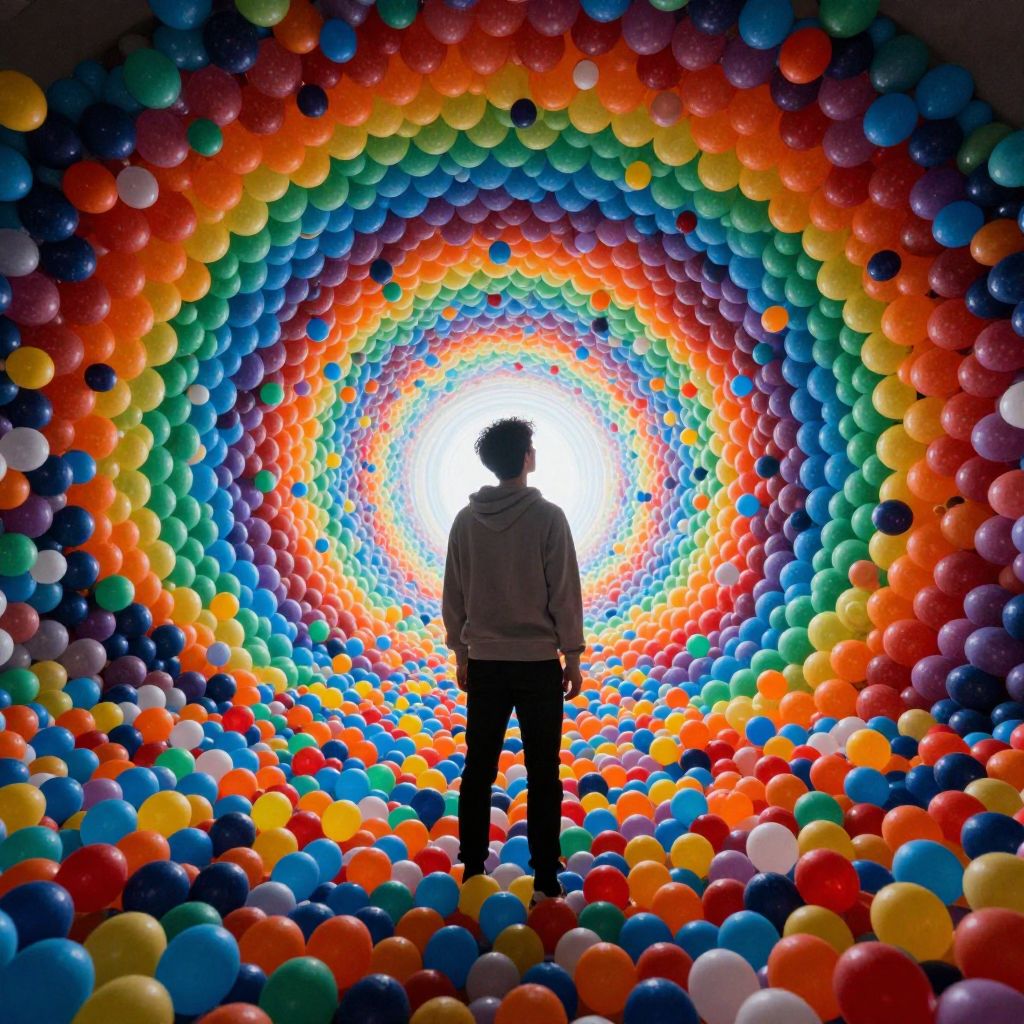 Photograph of a silhouetted person standing in the center of a vibrant, colorful, spherical tunnel made of hundreds of multicolored balloons. The balloons form concentric circles radiating from a bright white center, creating a striking rainbow effect. The person, wearing a gray hoodie and black pants, stands with arms relaxed by their sides, facing away from the camera. The image contrasts the dark silhouette against the vivid, luminous background, emphasizing the surreal and immersive quality of the balloon tunnel. The overall mood is whimsical and dreamlike.