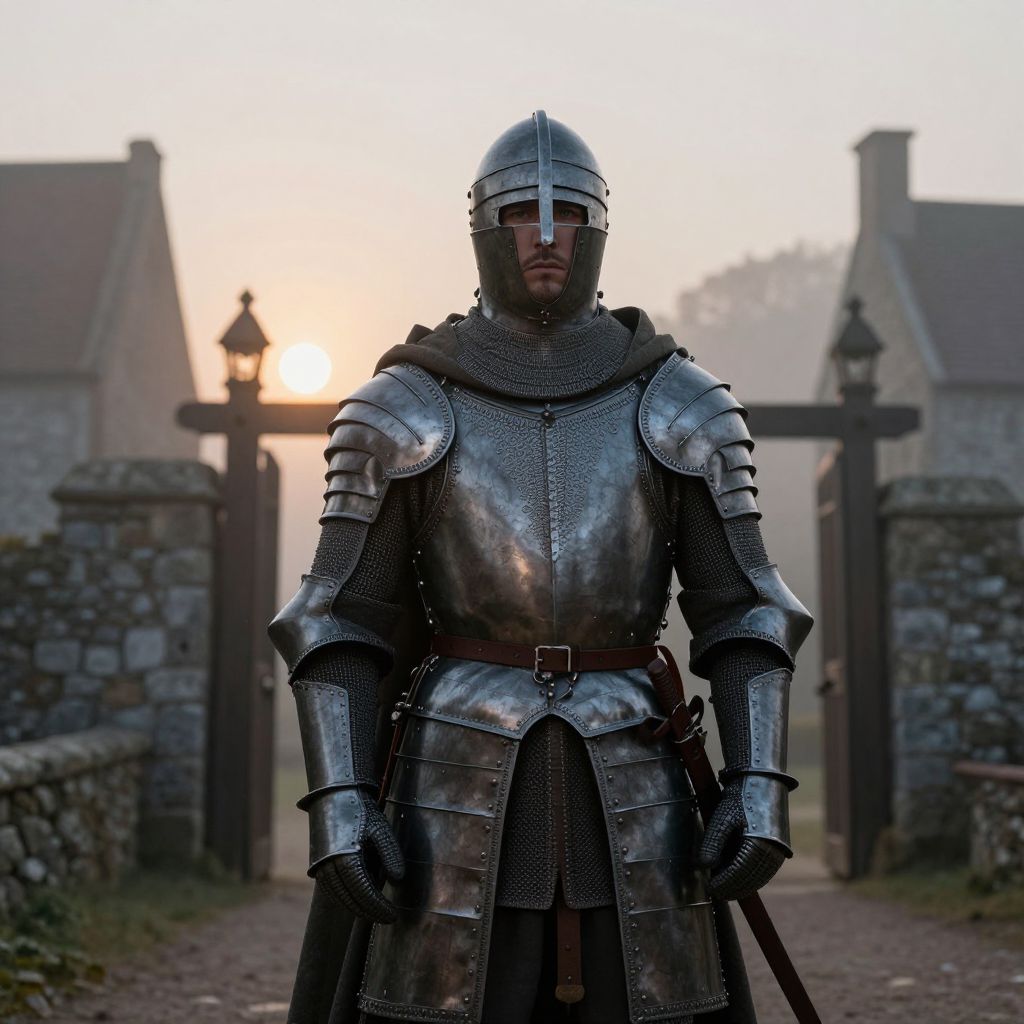 Photograph of a medieval knight in full steel armor with a visor, standing in a stone-walled courtyard at sunset.