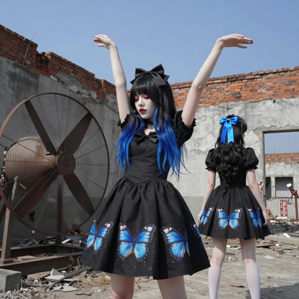 Photograph of two women in a ruined urban setting. Foreground woman with pale skin, black dress, butterfly-patterned skirt, blue and black hair, black bow, arms raised. Background woman with pale skin, black dress, butterfly-patterned skirt, black hair, blue bow, turned away. Large industrial fan to left, broken brick wall, clear blue sky.