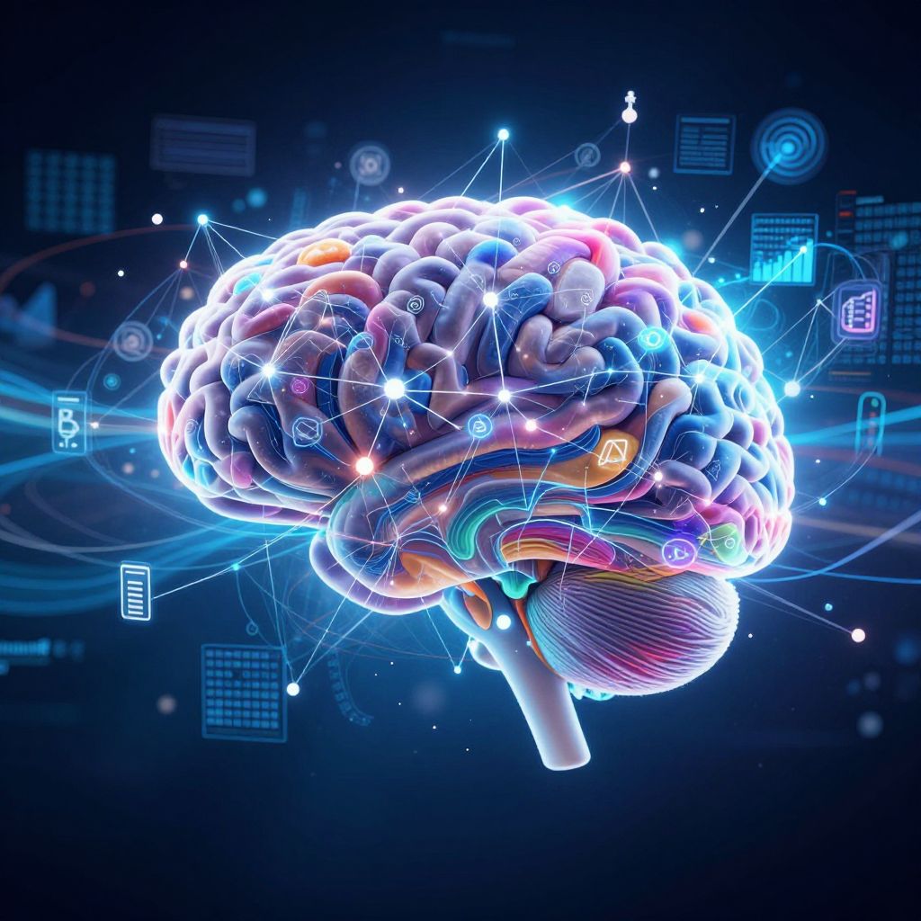 Analizame visualized as an abstract human brain surrounded by flowing data and analytical symbols, bright electric lines connecting complex nodes, vibrant colors with a high-tech scientific feel, rendered in a semi-realistic digital style.