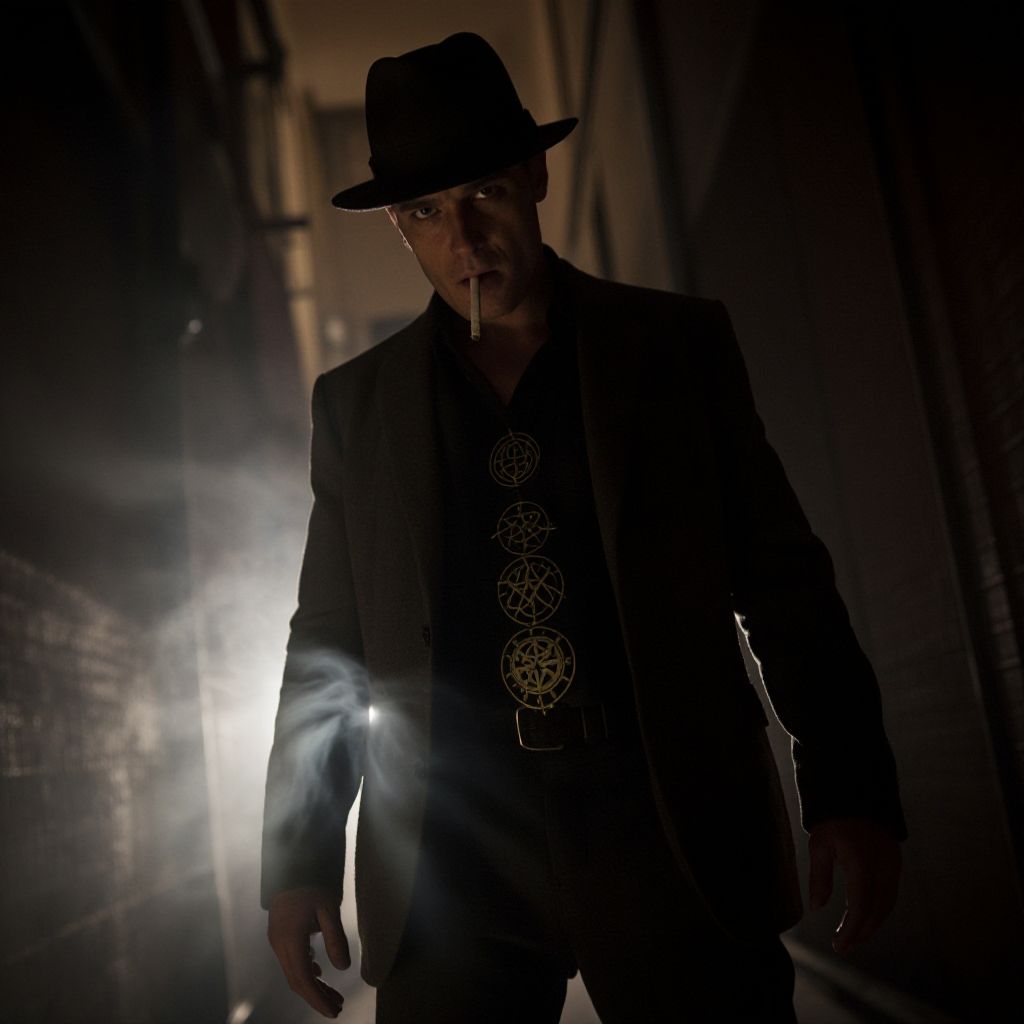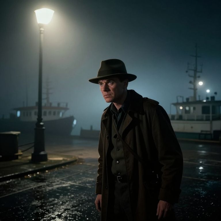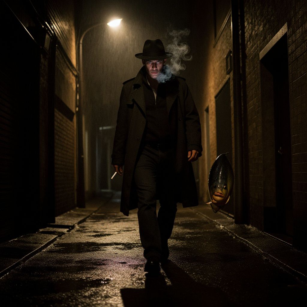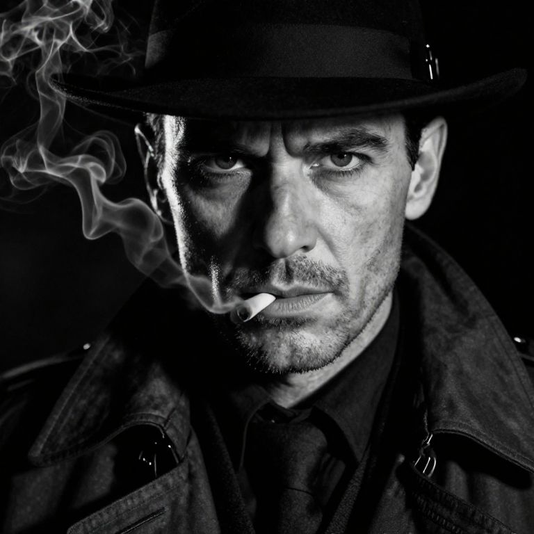 Gangster in a dimly lit urban alley at night, wearing a vintage leather jacket and fedora, standing against a weathered brick wall, rain falling softly, neon signs reflecting in puddles, gritty atmosphere with smoke rising from a nearby cigarette, cinematic lighting, high detail, photo-realistic style.
