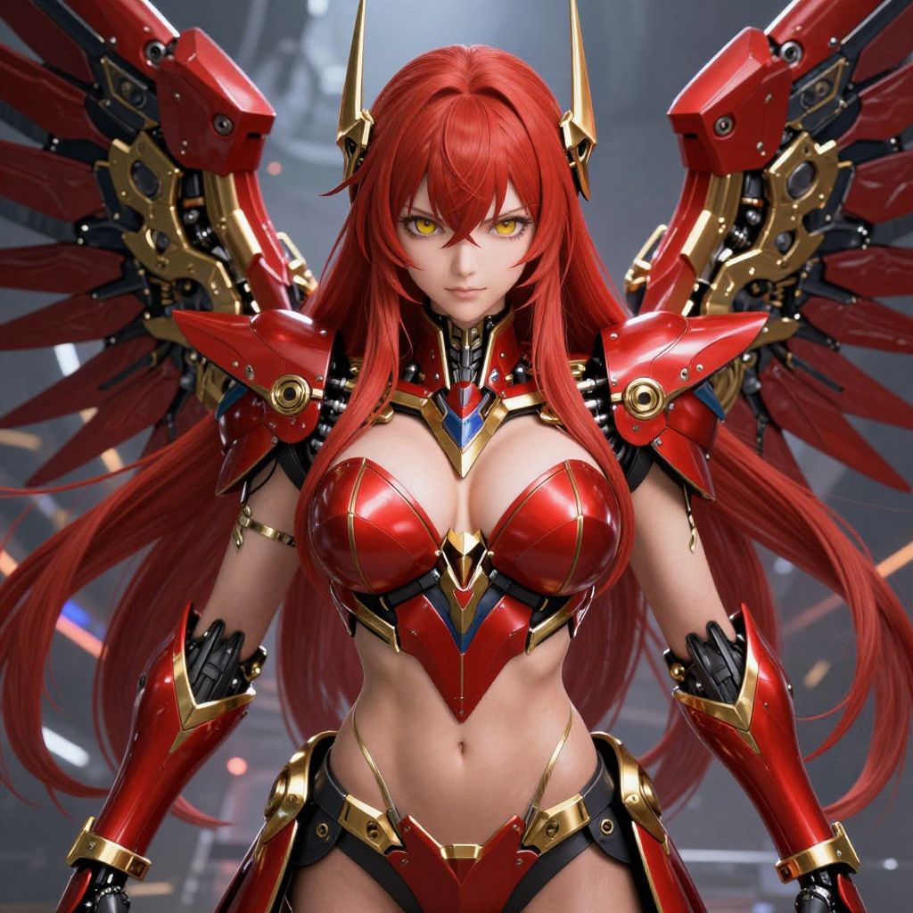Digital art, anime style, red-haired woman, long hair, yellow eyes, large breasts, revealing outfit, red and gold armor, mechanical wings, symmetrical design, dynamic background, futuristic, detailed, high contrast, muscular, confident expression, midriff, red and gold color scheme, Mech Girl, red hair, armor details, artist: WOLFRAM ALPHA, mech elements, sci-fi, fantasy character, detailed shading, vibrant colors