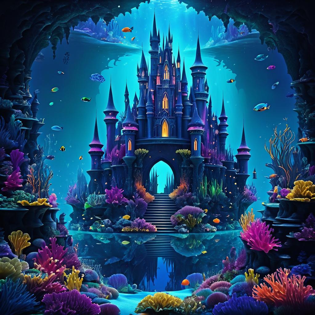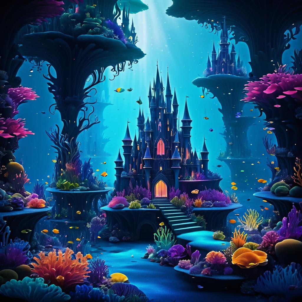A vibrant and mythical underwater scene showcasing a dark fairy-tale castle surrounded by colorful coral reefs and exotic fish. The fantasy landscape is illuminated by rays of light filtering through the water, revealing intricate details of the castle and lush marine vegetation. Inspired by the styles of David Doubilet and Michael Muller.