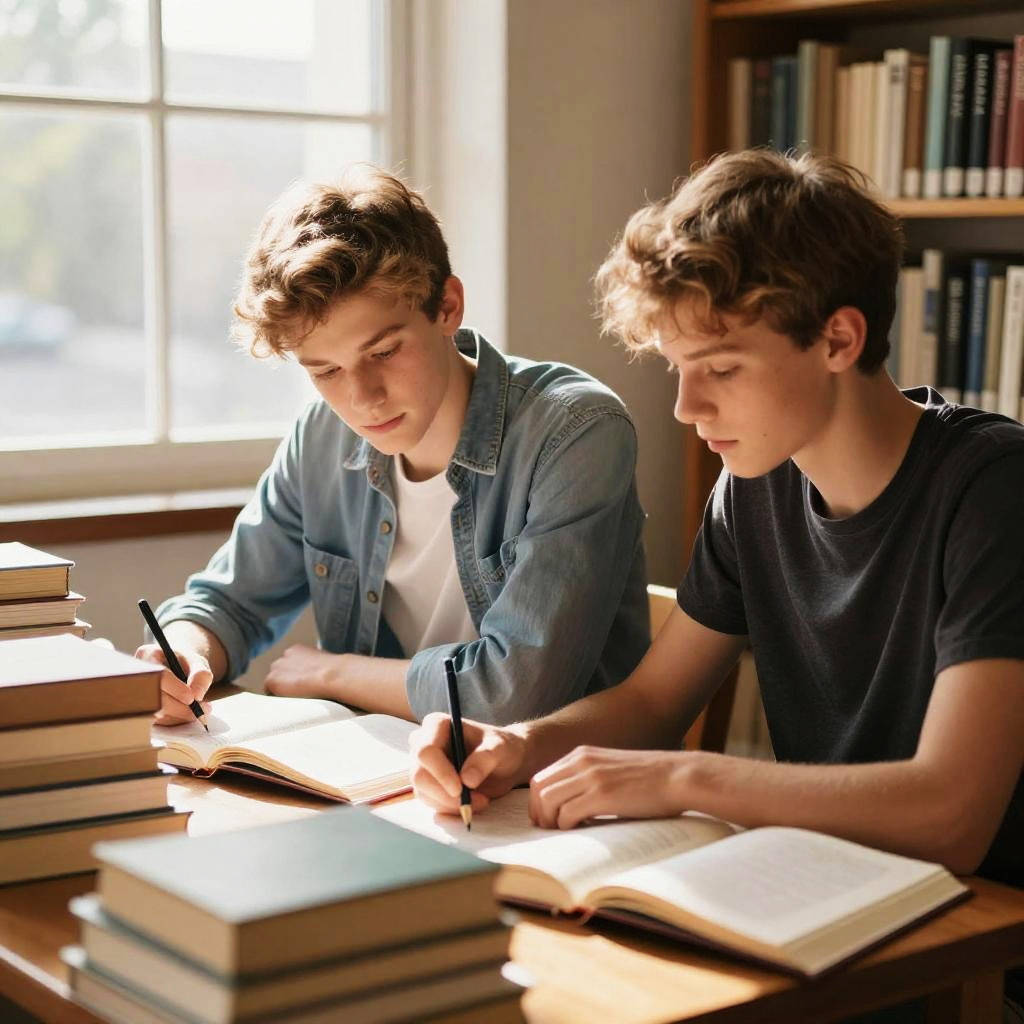Skinny teen boys studying together in a cozy library, warm light filtering through large windows, stacks of books, focused expressions, casual clothes