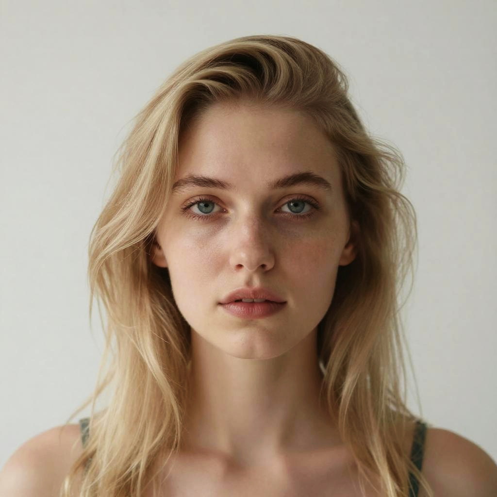 Photograph of a young Caucasian woman with light skin, blue eyes, and blonde, slightly wavy hair that falls to her shoulders. She has a neutral expression, slightly parted lips, and subtle freckles across her nose and cheeks. She is wearing a dark green tank top with thin straps. The background is a plain, light gray, which highlights her face. The lighting is soft, creating gentle shadows and emphasizing her natural features. The image is centered and cropped from the chest up, focusing on her face and upper torso.