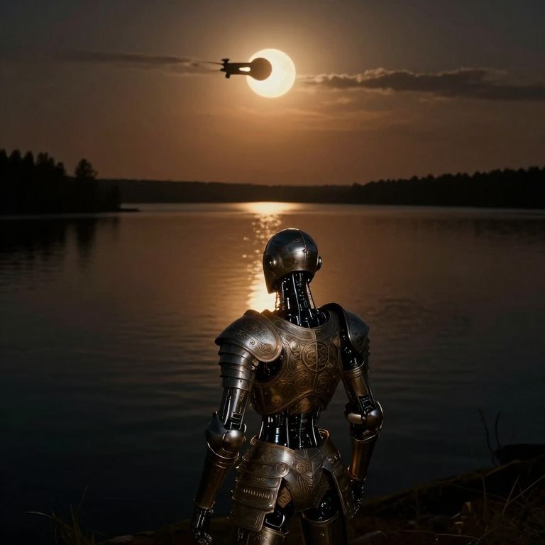 A dreamlike digital artwork captures a tranquil moonlit lake reflecting the mesmerizing glow of a celestial event, possibly an annular eclipse. In the foreground, an enigmatic figure materializes from the darkness - a sentient robot exuding an aura of both antiquity and futurism. Its intricate armor, adorned with filigree reminiscent of medieval knights, seamlessly integrates cybernetic components. The scene is viewed from an elevated perspective, as if observed through the lens of a drone, encapsulating the grandeur and solitude of this encounter. The warm amber hues cast by the celestial bodies harmonize with the cool metallic sheen of the robot's armor, evoking an emotional spectrum that balances reverence for nature with wonder at artificial intelligence. This composition, akin to the dreamlike aesthetics found in Simon Stålenhag's artwork and the cinematic storytelling of Blade Runner, portrays a moment where technology and mystique converge under the celestial dance of cosmic bodies.