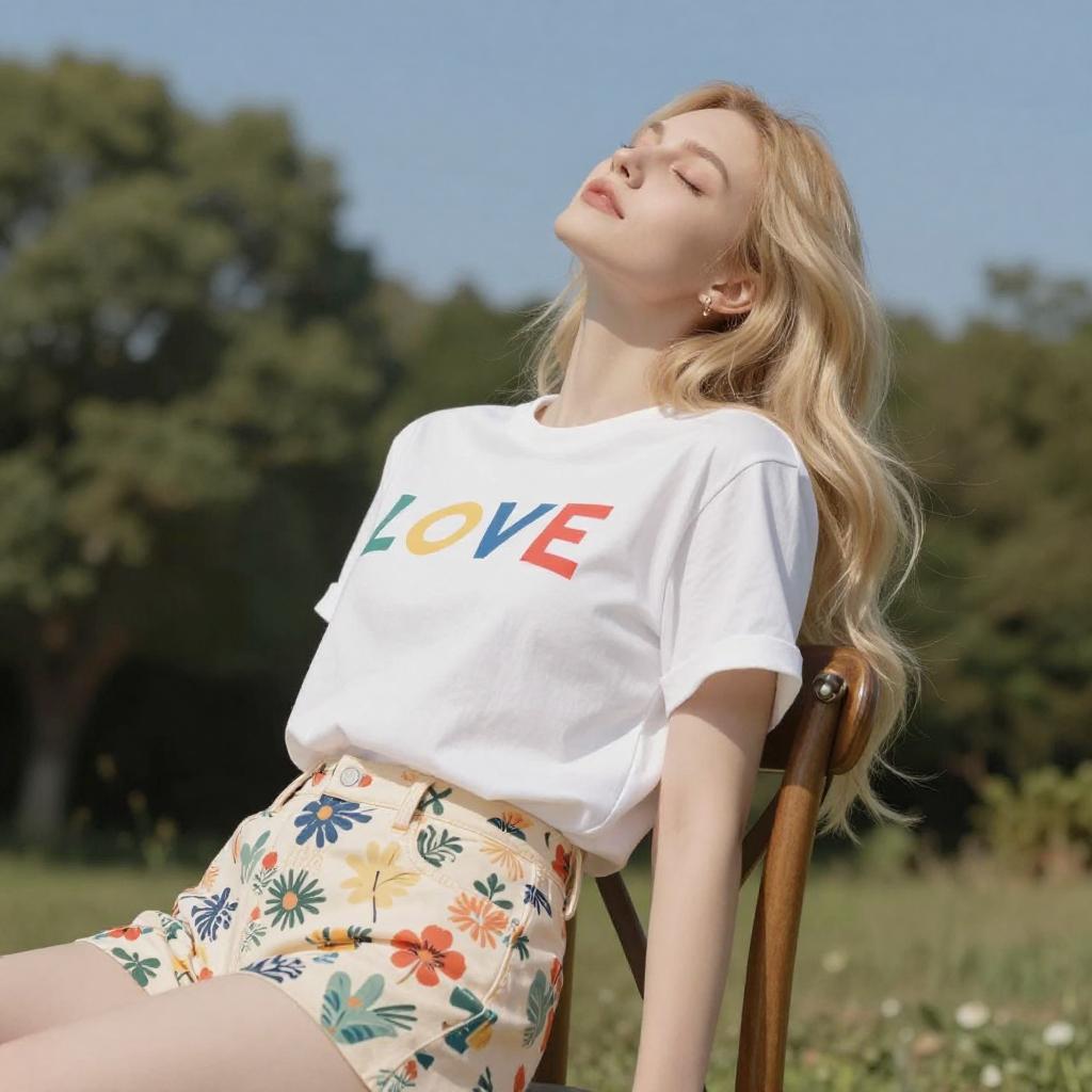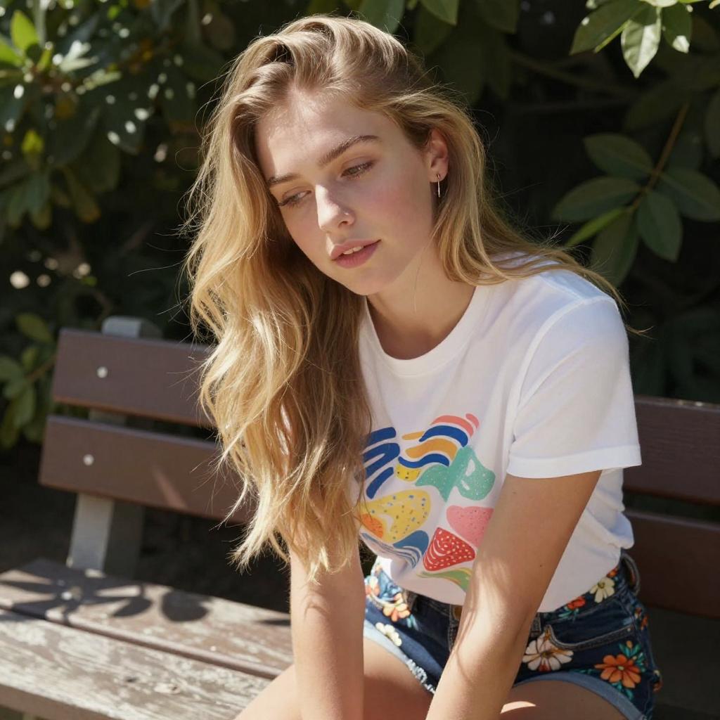 Photograph of a young woman with long blonde hair, leaning back on a wooden bench in a sunlit garden. She wears a white t-shirt with colorful "love" and floral shorts. Her eyes are closed, and she has a relaxed expression. Sunlight creates strong shadows, highlighting her fair skin and the green foliage in the background.