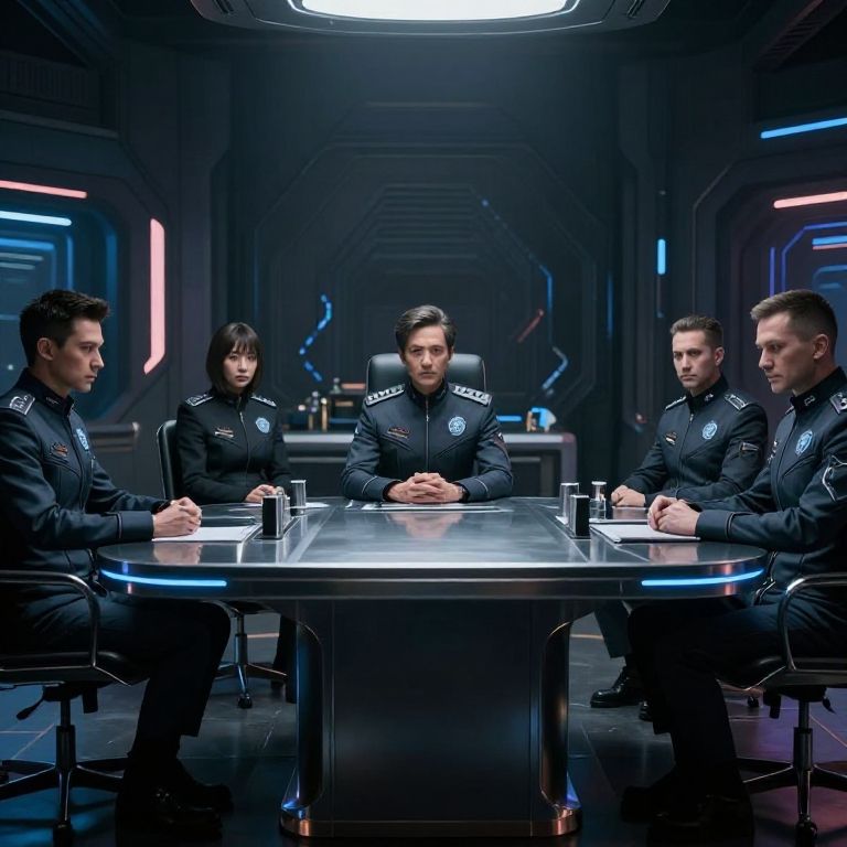 Photograph of five serious-looking, uniformed men with short dark hair, sitting around a sleek, metallic conference table in a futuristic, dimly lit room with neon blue and pink accents. The man in the center, with a slightly more muscular build, is wearing a dark jacket with a badge and epaulettes, suggesting a leadership role. The other four men, also in dark uniforms, are attentively looking at him. The background features geometric patterns and futuristic lighting. All men have fair skin and are seated on black, high-backed chairs. The overall mood is intense and professional.