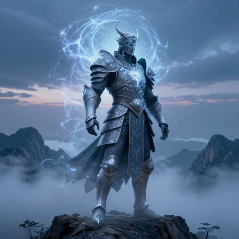 Azazrl as a mystical ancient guardian standing atop a foggy mountain peak, intricate armor glowing faintly with enchanted runes, surrounded by swirling ethereal energy, twilight sky casting a magical blue hue, fantasy art style.