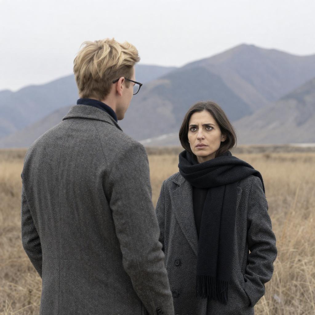 Black-and-white photograph of a man and woman standing together at night. Man on left has short blonde hair, beard, and wears a dark jacket. Woman on right has long hair, wears a scarf and dress, holds hands in front. Large, ured rock in background, car partially visible on left. Both look slightly serious.