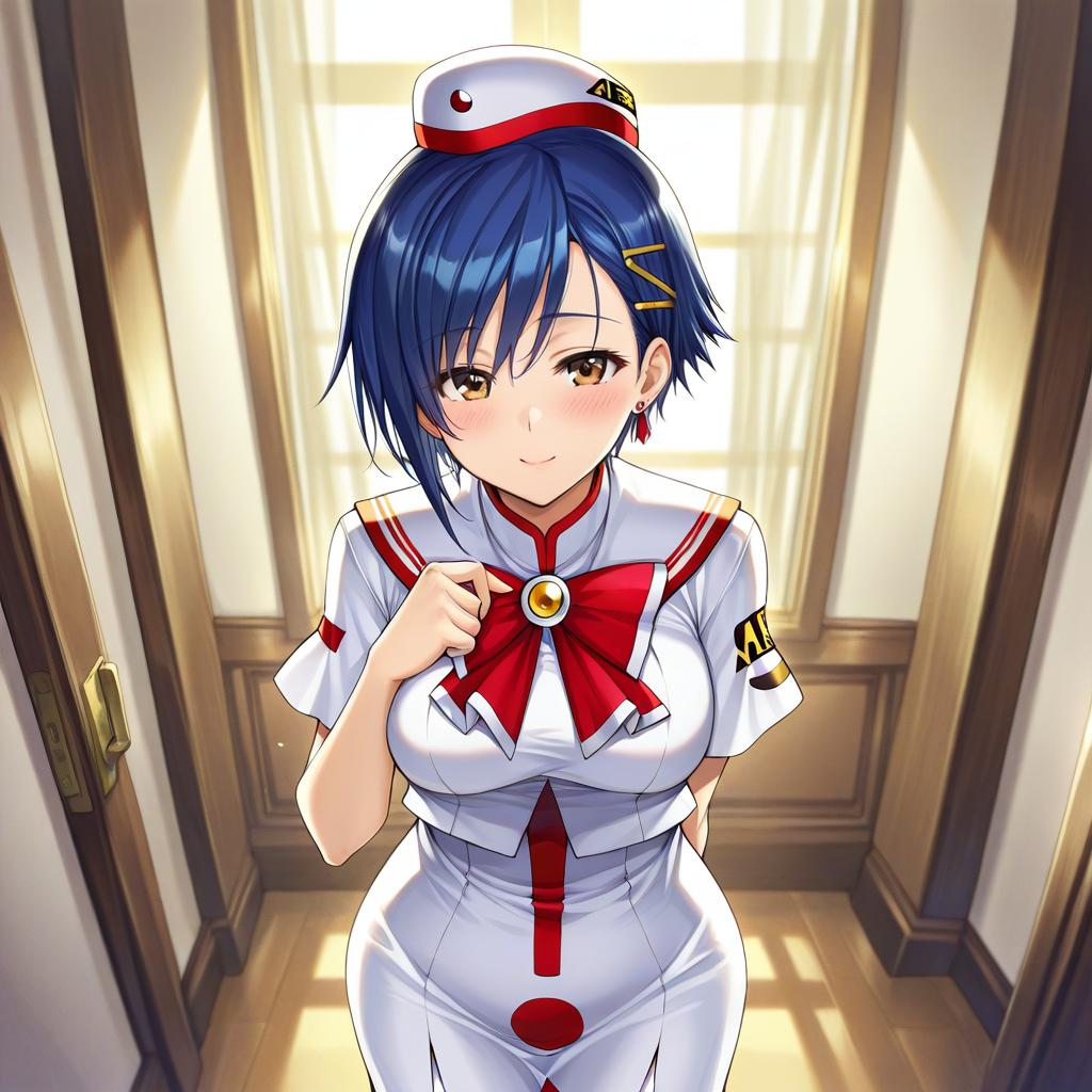 Digital illustration of a young anime girl with short blue hair and brown-yellow eyes. She is wearing a white Himeya Company uniform dress with a red bow and matching hat. The character has two yellow hair clips on the side and small red earrings. The background shows an illuminated hallway with wooden frames and a tiled floor.