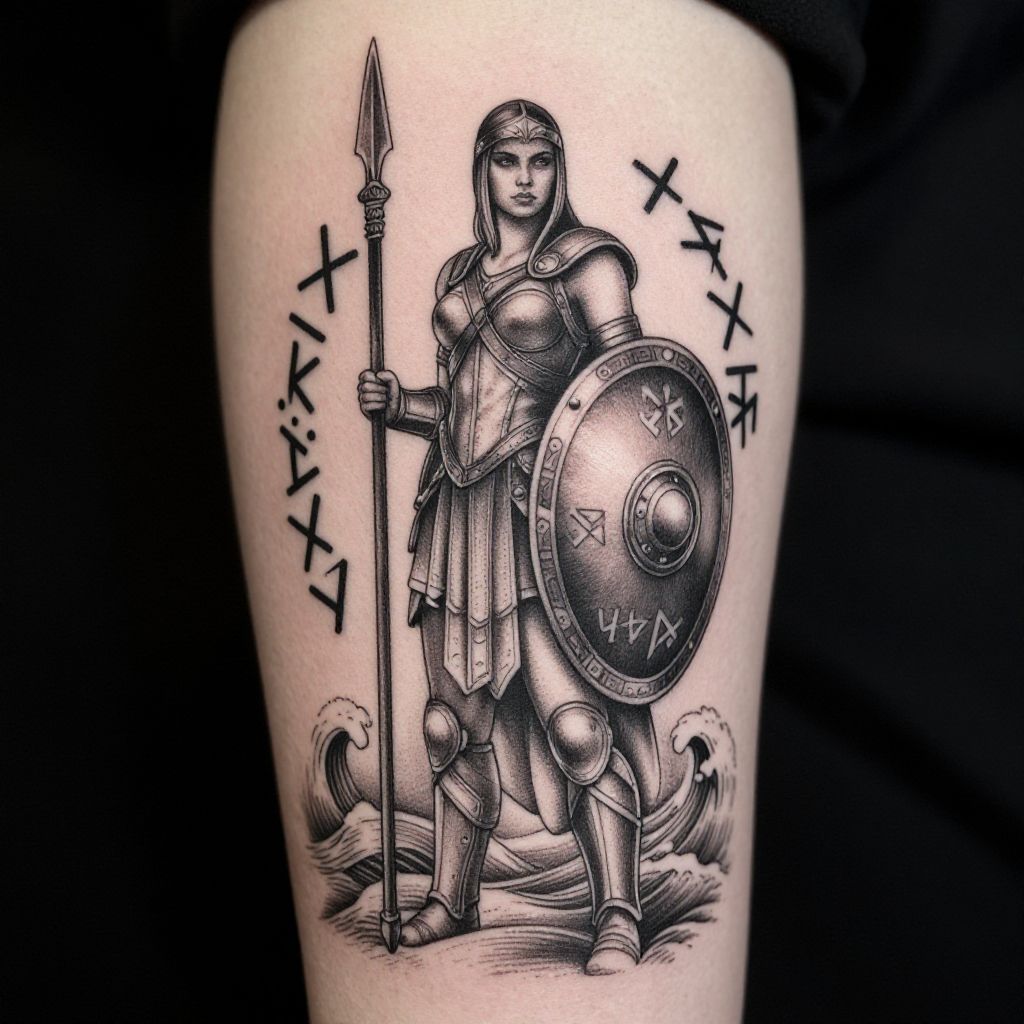 Female shield maiden tattoo concept featuring a warrior woman standing tall with shield and spear, surrounded by ancient rune symbols and Nordic waves, detailed black ink with delicate shading, blending myth and strength in tattoo art style.