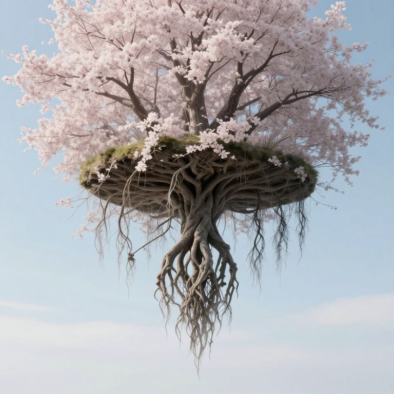 A digital illustration of a floating tree with a thick, gnarled trunk and sprawling roots, suspended mid-air against a bright blue sky. The tree is adorned with pink cherry blossoms, creating a delicate, colorful contrast to the dark, textured bark and roots. The tree's base is a small, circular patch of green grass. The image has a fantastical, ethereal quality, with realistic details in the tree's anatomy and blossoms, evoking a sense of magic and natural beauty.