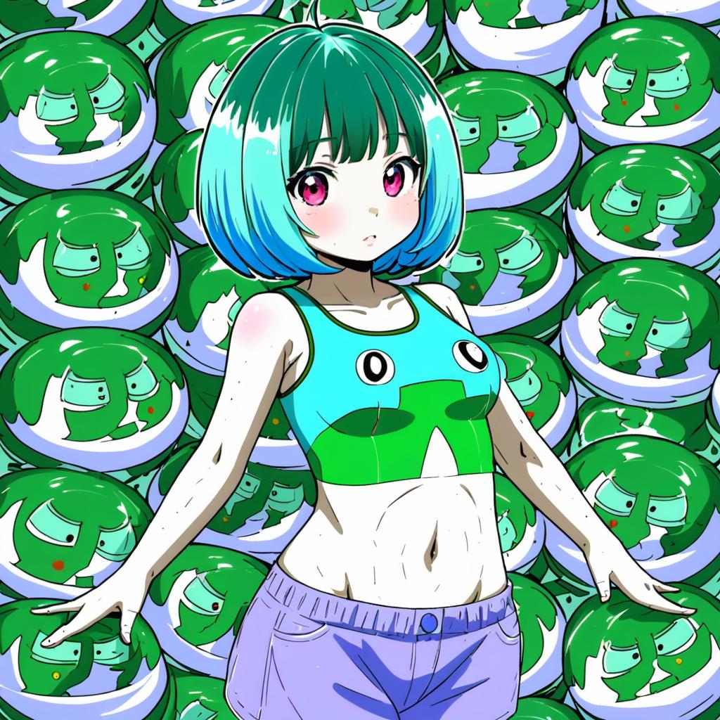Earth-chan, original, 1girl, brown eyes, blue hair, short hair, green hair, two-tone hair, large breasts, navel, by artist kekemotsu, anime