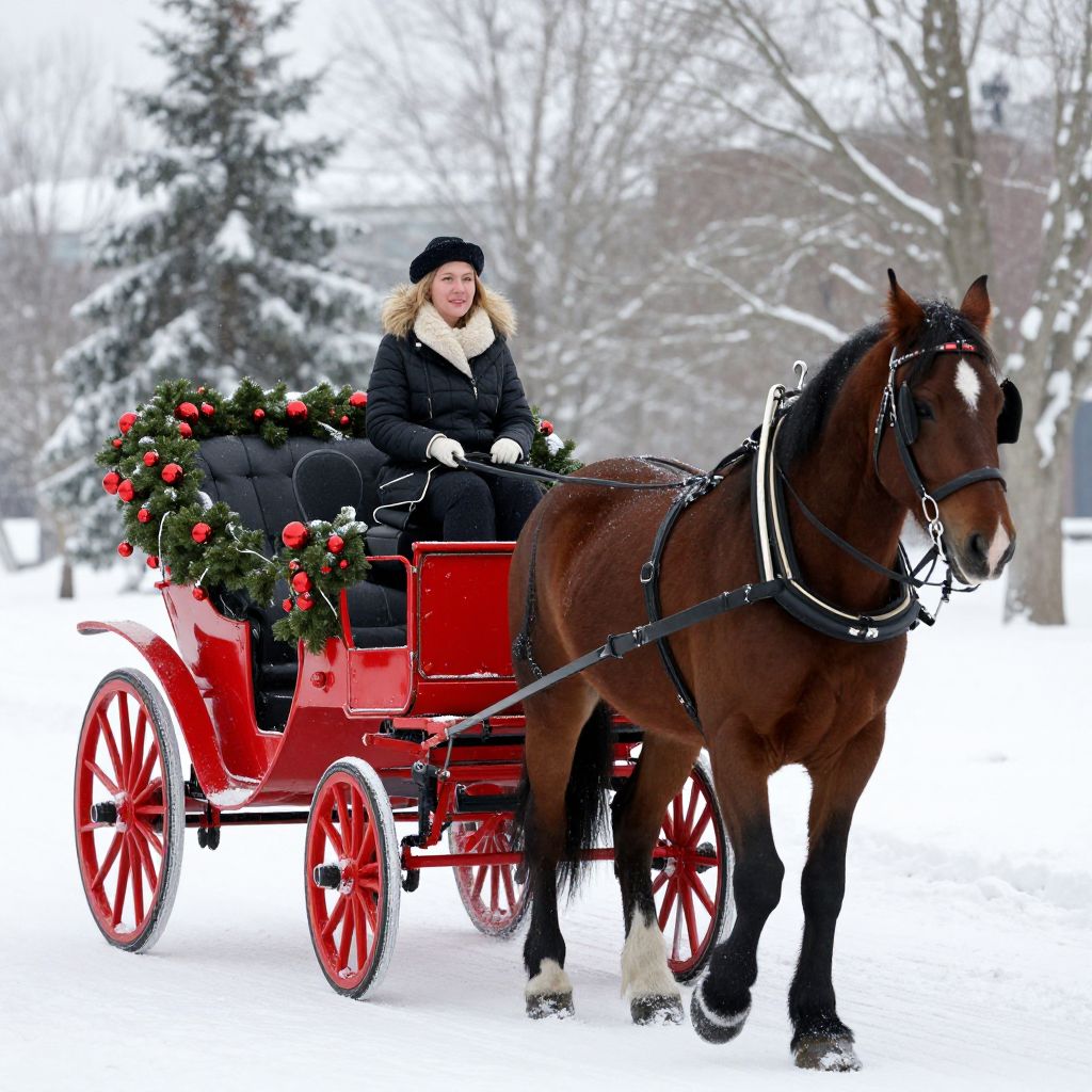 Woman enjoying a festive ride in a red horse-drawn carriage adorned with greenery and red ornaments, pulled by a brown horse through a snowy winter landscape.