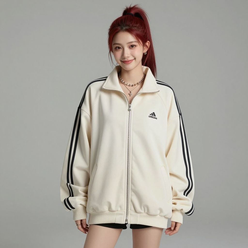 Masterpiece, best quality, 1girl, red ponytail, long hair, oversized track jacket, shorts, jewelry, smile, simple background
