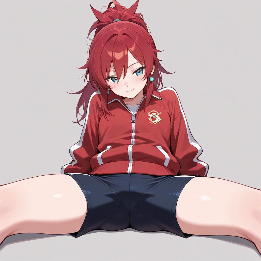 This digital anime-style drawing features a red-haired girl with a ponytail, blue eyes, and a slight blush on her cheeks. She wears a red zip-up jacket with a white logo on the left chest and black cycling shorts. She is seated with her legs spread apart, displaying her thighs prominently. The background is plain white, making the character the focal point. The artist uses bold colors and clean lines, typical of modern anime art. The girl's expression is calm and slightly shy, adding a touch of personality to the image.