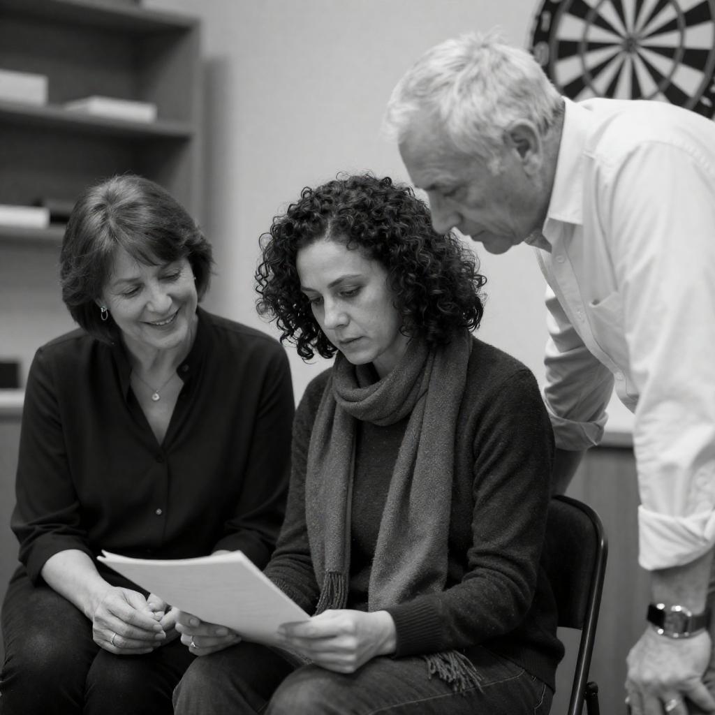 Black-and-white photograph of three people. A middle-aged woman with short dark hair and a black blouse sits on the left, smiling. A curly-haired woman in a dark sweater and scarf sits in the center, focused on a paper. A man with white hair and a white shirt leans over her from the right, looking at the paper. Background includes shelves and a dartboard.