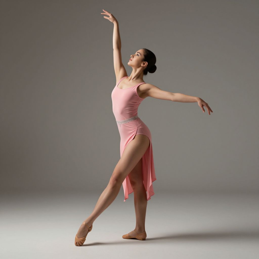 Photograph of a graceful ballerina in a pink, sleeveless, form-fitting leotard with a flowing, asymmetrical hemline and sparkling silver trim. She has a dark, neat bun hairstyle and wears beige pointe shoes. She stands on one leg with the other leg extended behind her, arms elegantly raised and curved. The background is a simple, gradient grey, highlighting her poised, expressive dance posture. The lighting is soft, emphasizing her graceful curves and the smooth texture of her leotard. The overall composition conveys elegance and movement.