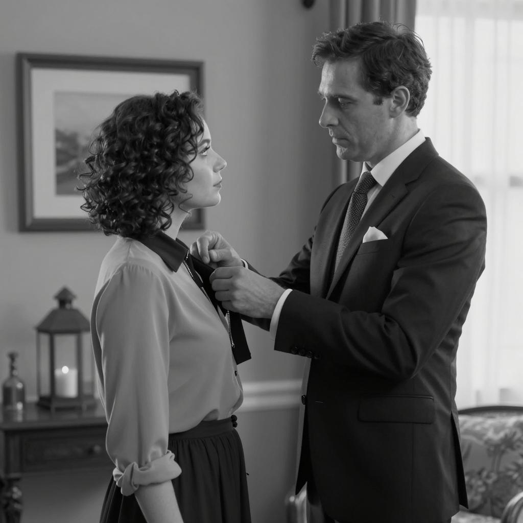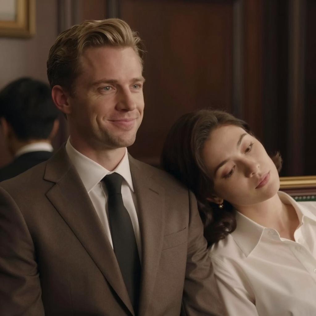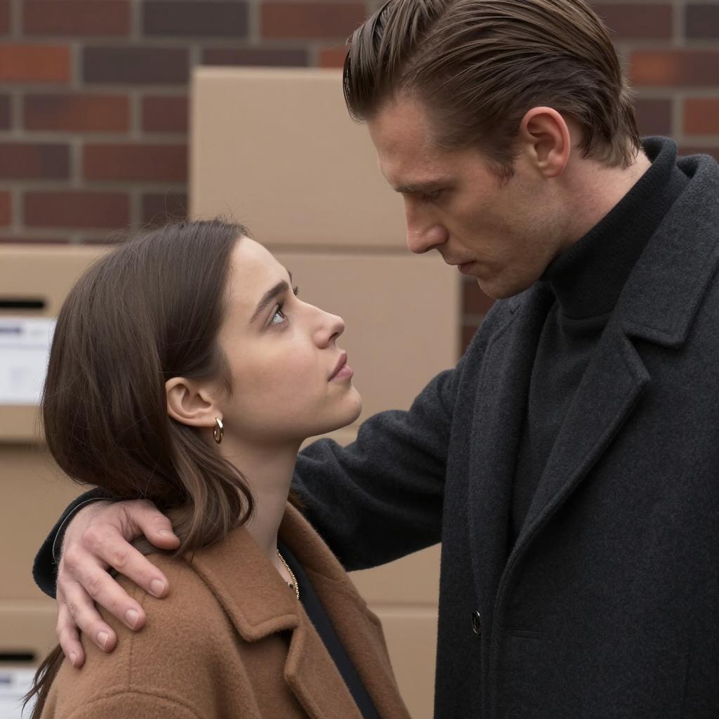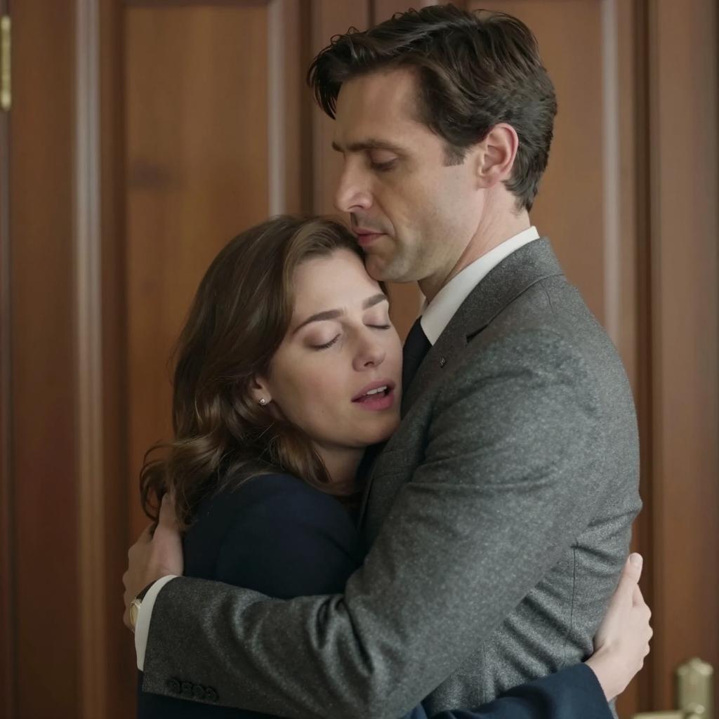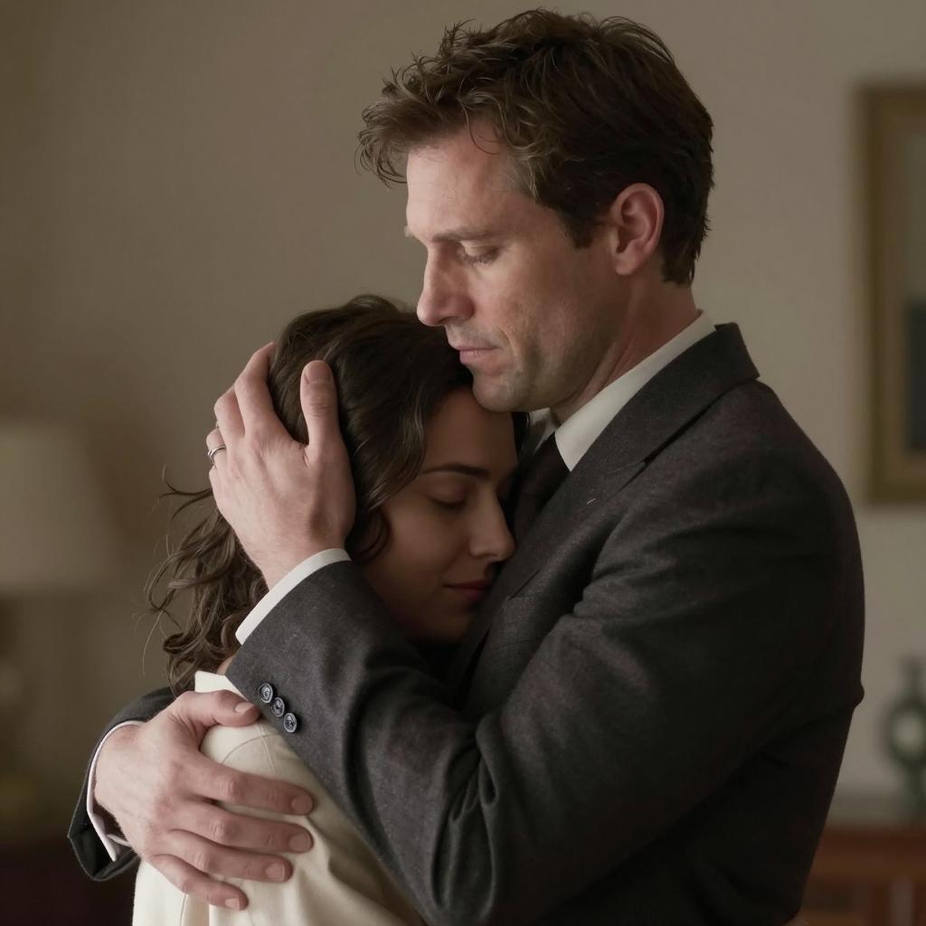 A man and woman hugging. The man, with short, wavy brown hair and a serious expression, wears a dark, ured suit. He holds the woman's head gently with his right hand. The woman, with dark, wavy hair and closed eyes, wears a light-colored top. The background is dimly lit with indistinct objects. The man stands behind the woman, slightly to the right.