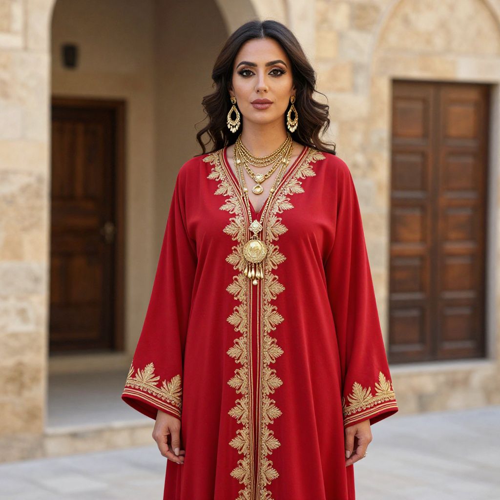 Woman wearing a vibrant red Moroccan-inspired caftan with intricate gold embroidery, accessorized with layered necklaces and dangling earrings, standing gracefully against a backdrop of stone architecture and wooden doors.